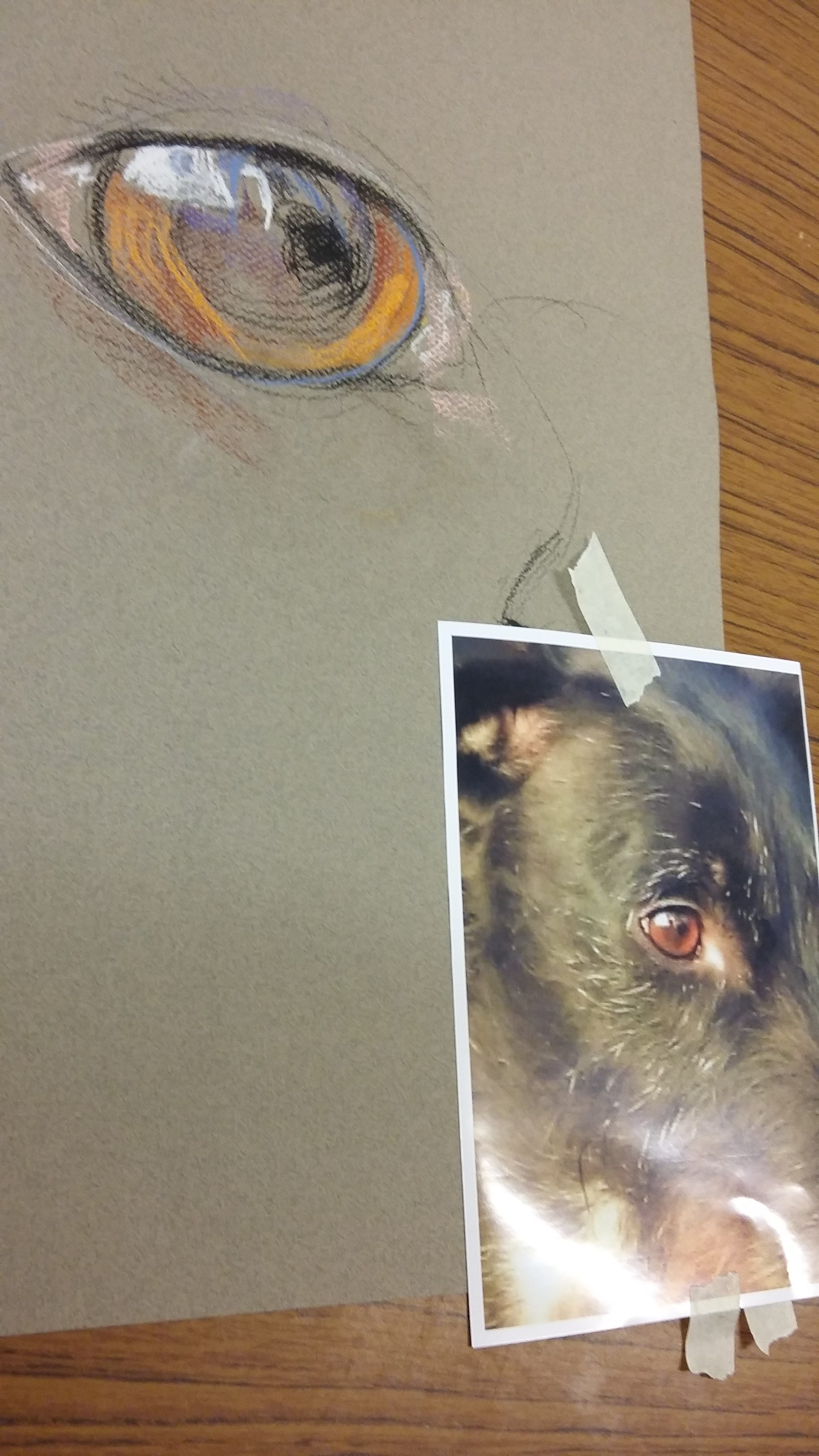 Peter also paused to show us how to get the detail of an eye, he took his photograph and used the pastels to paint the eye of the dog, showing shape and highlights which make the eye come to life.