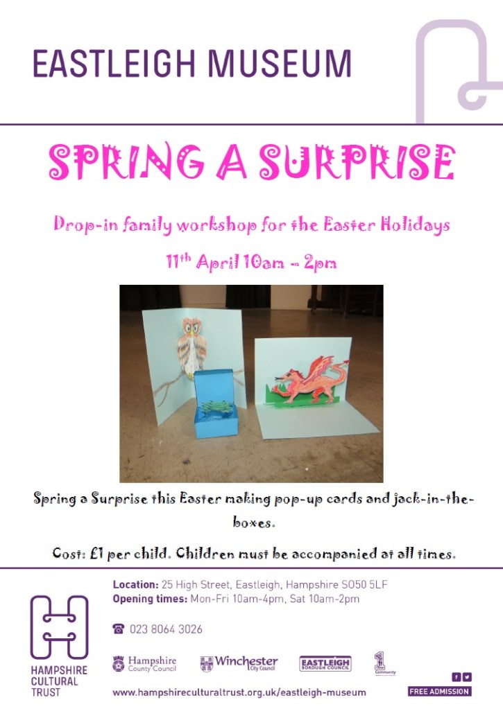 this is a drop in workshop running on the 11th April from 10am until 2pm, where you can make pop up cards and Jack in the boxes. Cost is £1 and all children must be accompanied.